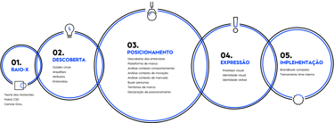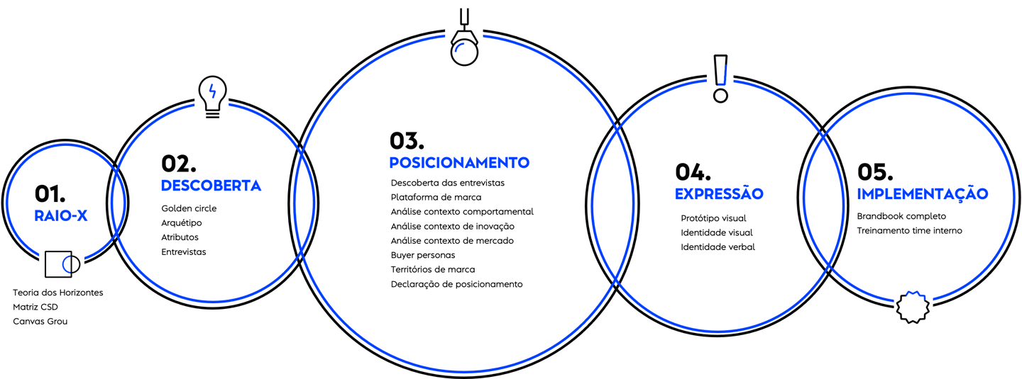 Uma jornada baseada em 5 grandes momentos de trabalho. Reuniões que vão gerar reflexões sobre o futuro do negócio, o modelo de gestão, a estratégia de comunicação e até mesmo como o seu público enxerga e interage com você. Perguntas que serão respondidas com uma estratégia de branding sólida, consistente e que responda aos problema da sua marca e do seu negócio.
